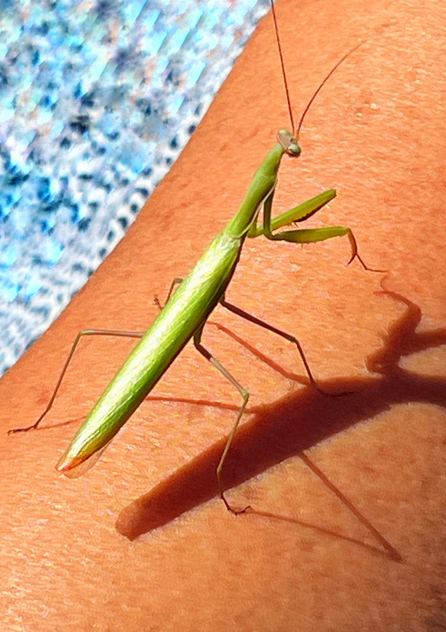 My New Day is winding down, now; there is not so much more that I will need before I rest my head on my pillow and sink into my dreams, to reflect on the beauty I have experienced here on my little postage-stamp home in the Okanagan Valley. Before I sleep, I step out onto my back patio, the better to hear the rhythmic pulse of the crickets, and beyond, the hushed hooting of our local Great Horned Owl as he perches on our roof, awaiting movement and the snack to follow as mice scamper deep in the vast folds of golden-grass hillsides. Then, I feel something touch me on my arm; I look down. A Praying Mantis has decided to anoint me as a Person of Interest, and I enjoy his company for a few moments before he realizes I can do nothing for him but offer a safe resting spot and moves on. I feel privileged by his short visit.