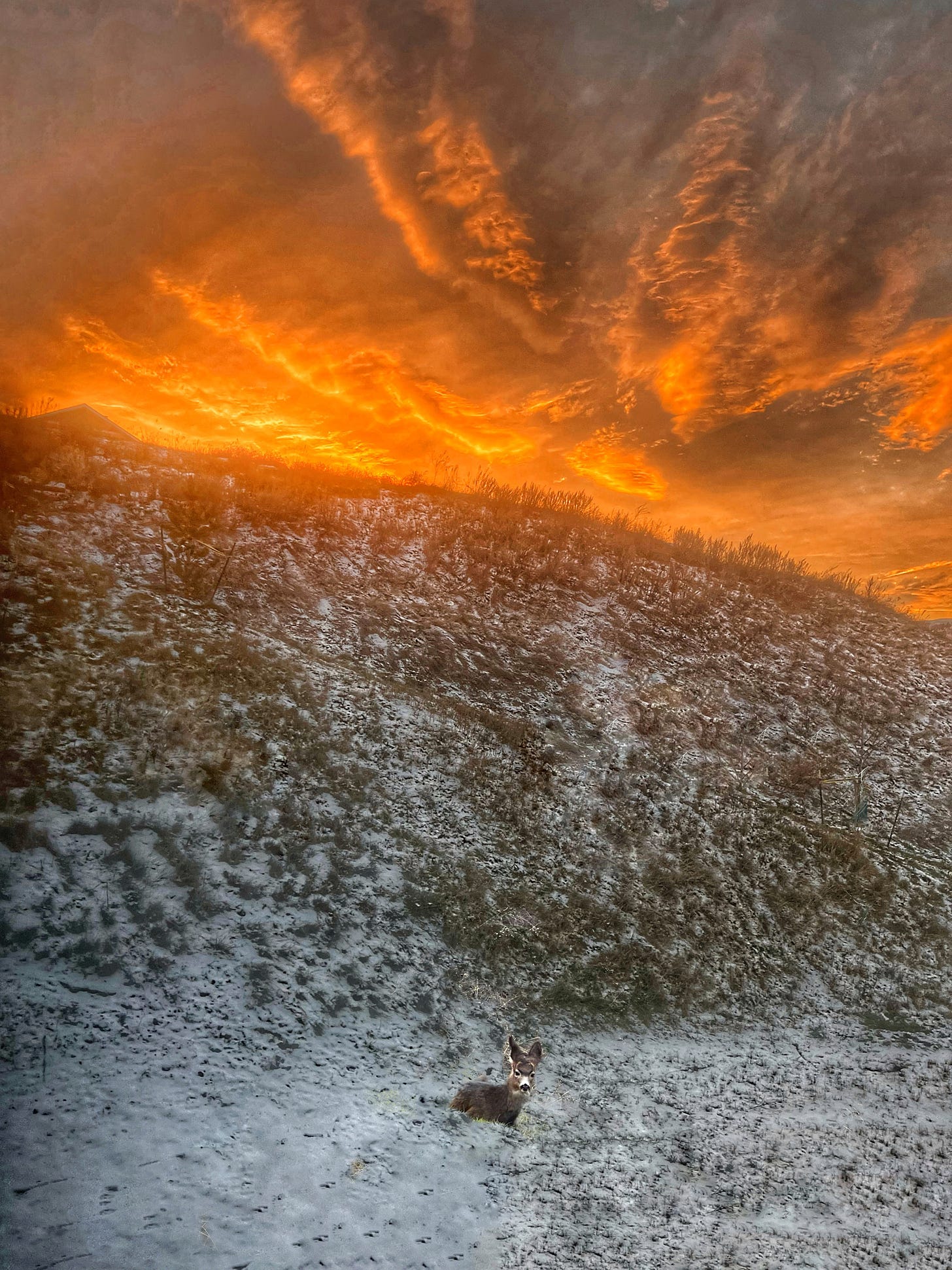 Back in my February kitchen, the sun has continued her reluctant rise, although it is clear that she does not like this month any more than I, and wishes to stay hidden, burrowed into the dark hatch of night, resting her face upon the furry thatched slope of the Silver Star Foothills, sleeping for another few weeks. It brings me some small comfort that February is an abomination for her as well. I look through the sliding patio door out to my front deck once again, sigh, and step into my fuzzy slippers. I pull my dressing gown closer, tighter, and step outside.