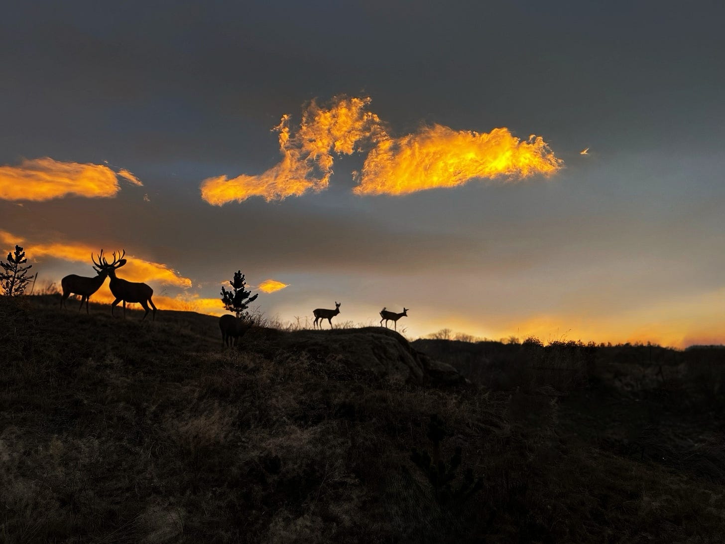 The sky is a honeypot of crimson, gold and purple now, and as the astounding hues deepen, I realise what a perfect day it has been. I breathe in. Breathe out. One more time, take a deep pull of the arid night heat of summer into my lungs, even if, for now, it is only in my mind. It is only when I look back one last time to witness the spectacle of this staggering sunset that I see something truly enchanting. There, nestled on the slope, a baby deer has chosen to sleep here, near us, for the night. I feel like a little bit of magic just happened.