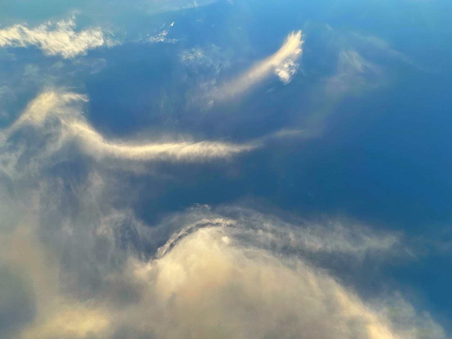 The images begin to coalesce, a sudden, sweet wind ruffles my hair. The bitter ochre sky becomes blue, with just enough chubby clouds floating by to paint a picture in my mind, a young lady in a billowing white gown, perhaps, reclining against the buttermilk nebula, her face in soft profile, hair streaming down her back, her arms raised in …… supplication? Celebration? Better…..much better, but what else?